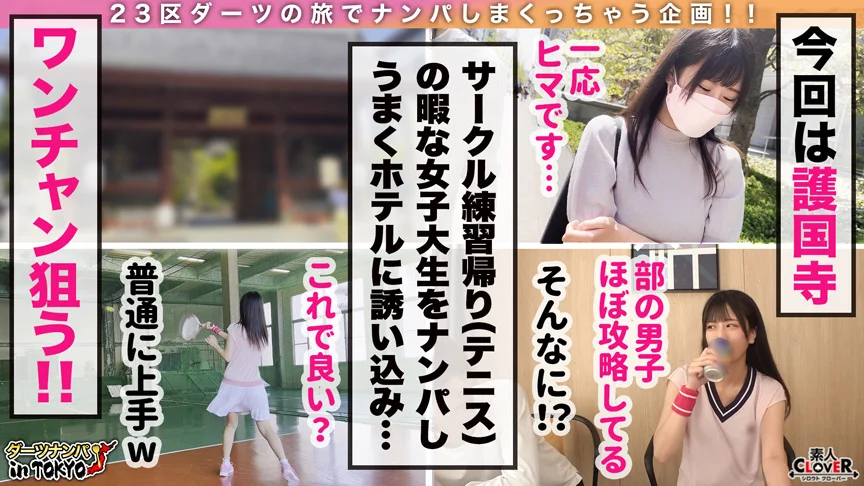 清楚な見た目でヤリマンでか乳女子【あいり/20歳/女子大生】東京の23区の地図にダーツを投げ、刺さった街で女性をナンパする企画ダーツナンパin Tokyo!今回は文京区護国寺へ!駅の出入り口で張っているとテニスラケットを持ったカワイイ女の子を発見♪今回の女の子は近くに住む大学帰りの女子大生『あいり』ちゃん。歩きながらお話を聞くとテニサーという名の飲みサーに所属しており、好みの男性を狙ってはヤリまくっている肉食系なあいりちゃん。さすがに手を出し過ぎたせいかサークルは崩壊寸前…サークルクラッシュする前に他のサークルに移ろうとお悩みな模様。ラケットとテニスウェアを持ち歩いているということなので腕前を披露してもらう為、近くのバッティングセンターへ♪可愛いピンクのテニスウェア姿に着替えたあいりちゃん。生地が薄いのかほんのり透けていてスタイルの良さが隠しきれていません。テニスで汗をかいたので、休憩がてらホテルで飲もうと誘うと笑顔で快諾。ホテルインして乾杯するとノリ良く応えてくるあいりちゃんにエッチなイタズラをしまくる一行→そのままノリでピチピチの女子大生とハメちゃいました♪サークル内の男を喰いまくっているからか、グリップ(肉棒)の扱いはかなりお上手なあいりちゃん。ご自慢の柔らか巨乳パイズリでバキバキにされ、立ちバックで挿入…念のためゴム装着の有無を聞くと「(生で)全然いい♪」と生ハメに躊躇が無いようで遠慮なく生膣にブチ込ませていただきました!膣奥が気持ち良いのか、深くまで挿入すると身体を仰け反らせてイキまくる敏感ボディ。中出しにも抵抗が無かったのでそのまま2連続中出しさせて頂きました♪柔らかさ抜群美巨乳&締め付け抜群トロトロ名器…こんな女の子に言い寄られたらそらサークルも崩壊しますわ。#女子大生#サークルクラッシャー#テニスウェア#柔乳#美巨乳#パイズリ#中出し。