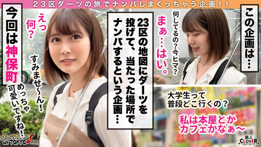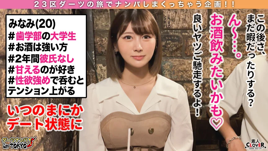 【みなみ/20歳/大学生】東京の23区の地図にダーツを投げ、刺さった街で女性をナンパする企画ダーツナンパin Tokyo!今回は千代田区神保町へ!駅近くを散策していると可愛らしいワンピースの女の子を発見♪今回ナンパした女の子は歯科衛生士を目指して近くの大学に通う女子大生の『みなみ』さん。時間が空いているということでお薦めの本屋さんとカフェを紹介してもらうことに。お話を聞くと現在彼氏はおらず、学部に男子が少ないので出会いがないと嘆くみなみさん。呑むことが好きということでお酒で釣るとホイホイ付いてきてホテルへ連れ込み成功!乾杯して酔いも回り、卑猥な話で盛り上がった流れのままSEX開始しちゃいました♪服を脱いでもらうと隠れていたムチムチ感溢れるぐぅシコボディが出現。重量感のある巨乳に陥没乳首が滅茶苦茶にエロい…!勃起チンポを目の前に出してあげると上目遣いをしながら笑顔で美味しそうにチンポを頬張り、縦横無尽に動く舌技に射精寸前…綺麗なパイパンマンコを電マでほぐし、みなみちゃん得意の騎乗位で生挿入してもらいました。ご無沙汰のSEXだったようで味わうようにねっとり腰を動かす蕩け顔のみなみちゃん。次第に腰振りが早くなりエゲつないムービングの騎乗位を披露してくれました。四つん這いになってバックで突いてあげると、良いところに当たるからか髪を振り乱しながら絶頂し、締まりまくる極上マンコ。脳が快楽に満たされたところでみなみちゃんがイクと同時に膣奥へ中出してあげました♪2戦目は白衣に着替えてもらい、ゴム手袋を装着してチンチン検査開始。「イケないことしてる気がする…///」と背徳感を感じながらマンコを濡らし、再び騎乗位挿入…ガニ股で腰を振って仰け反ながらイキまくり、指マンしてあげると潮を吹き出してベッドはグチョグチョ状態に。みなみちゃんの感度がどんどん上がり、絶頂を繰り返すキツキツマンコにこちらも射精限界!最後は可愛いお口に向けていっぱい射精してあげました♪お掃除フェラもしてもらって久々のSEXに「最高だった…///」と満足気なみなみちゃん…またチンポが恋しくなったら連絡してください!!