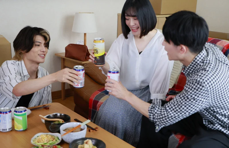 最近同棲を始めたばかりの耕平と飛鳥。荷解きも落ち着き、友人のシンヤを呼び宅飲みパーティーをすることに。久々の学生ノリでつい飲み過ぎてしまう面々。潰れてしまいソファで寝落ちしたシンヤが居るにもかかわらず、忙しくてイチャつき不足だった耕平が飛鳥のカラダを弄り…二人して歯止めが効かなくなってしまい…!