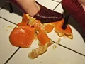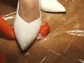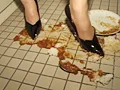 ケーキ、野菜、果物、弁当、シュークリーム、ソーセージ、豆腐など。色んな食べ物を次々とヒールやパンプス、生足で踏み潰しちゃいます。