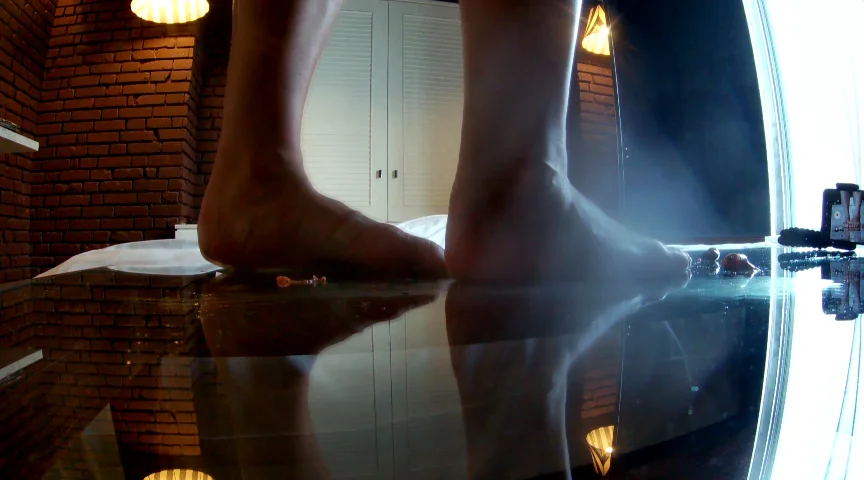 大人気、みくちゃんの綺麗な素足、足の裏もたっぷり堪能できるフェチにはたまらない映像です。なかなか滑って踏めないところを、自分で踏みやすい場所探してゆっくりと潰していきます。かかと落とししてみたり、ぐちゃぐちゃにしてみたり、様々な角度から撮影。自分が踏まれているような、ガラステーブルの下からの映像は興奮しっぱなし。