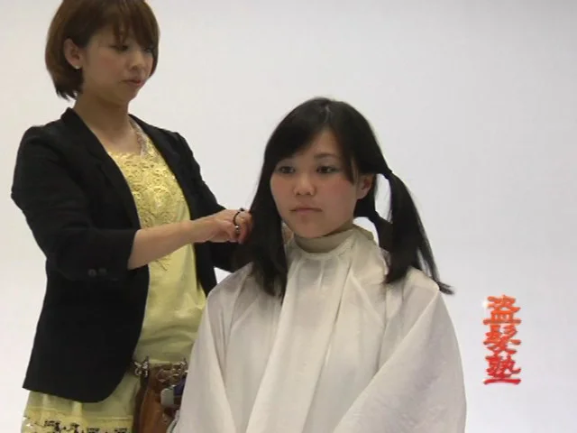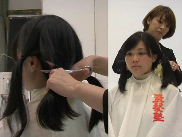 今回は黒のロングヘアーのあきほちゃんが登場。髪の毛を4等分にわけ、その結び目からハサミでバッサリ切り落としていきます。あっという間に髪が短くなりました!!その後は、霧吹きで濡らし、丁寧にカットしていきベリーショートの完成です!!