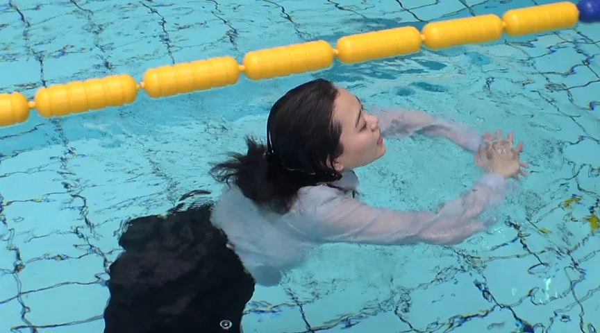 上着を脱いで軽装になってからもうひと泳ぎ。ざぶんとプールに飛び込み。少し軽くなったせいかクロールでバンバン泳ぎます。 ※本編中、音声・画質に不鮮明な箇所がありますが、異常ではありません。