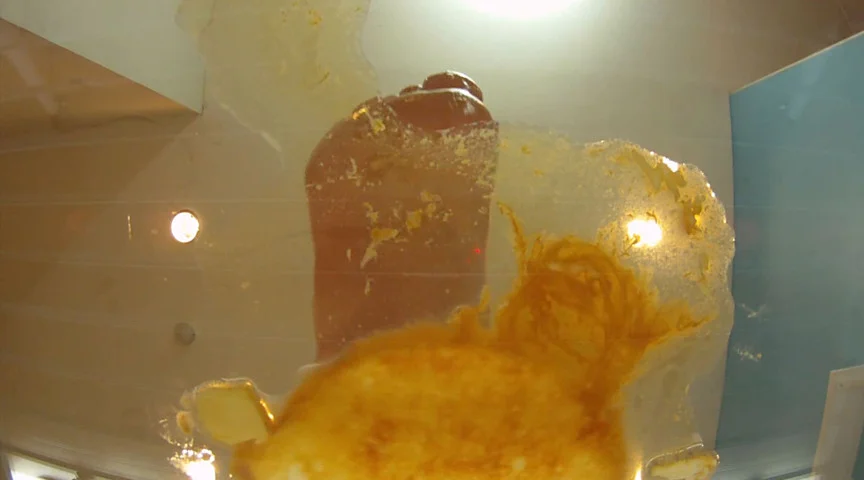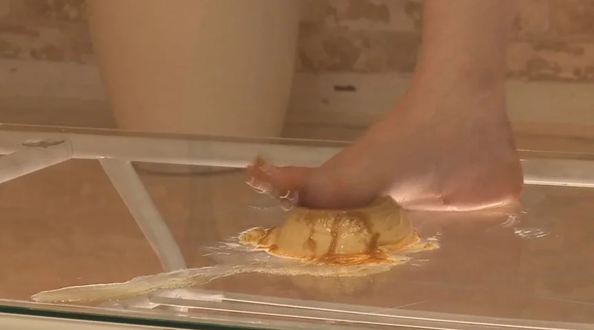 最初はプリンが崩れてしまわないように、足の指先でツンツンとやさしく弄びますが、次第にスイッチが入り、小悪魔の形相でプリンを汚物のようにグチャグチャにします。踏み潰されたプリンはクリーム状に変わってしまいました。