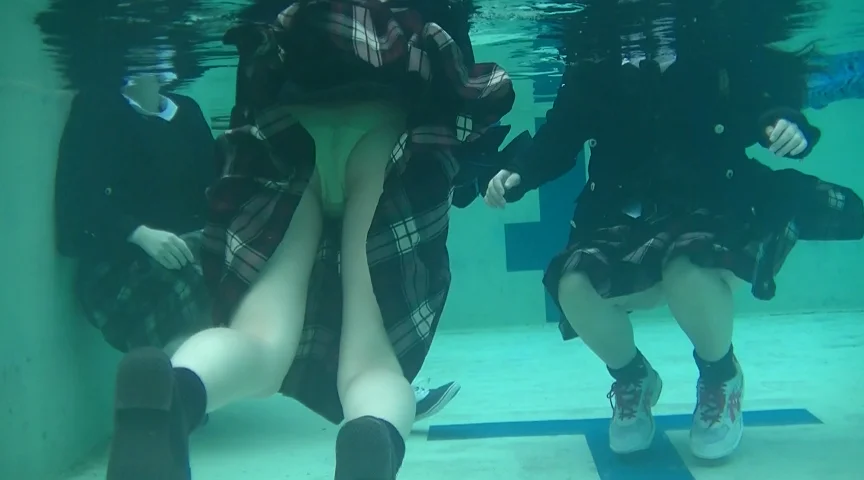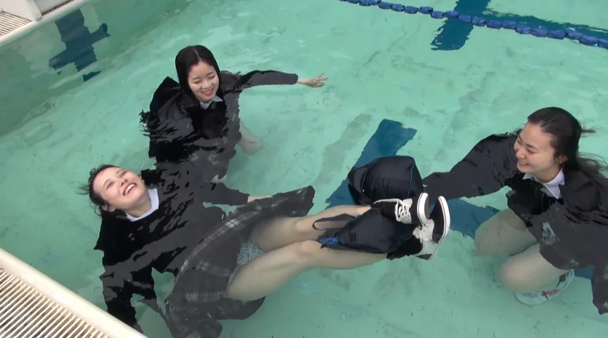 冬制服のままでも浮き具を利用してサバイバル。プールサイドにバッグを発見!とりあえず浮くかどうか実験!!ぐるんと回転して危ない場面も…。背負ったり抱っこしてみたり、足に挟んだりと色々試していました。