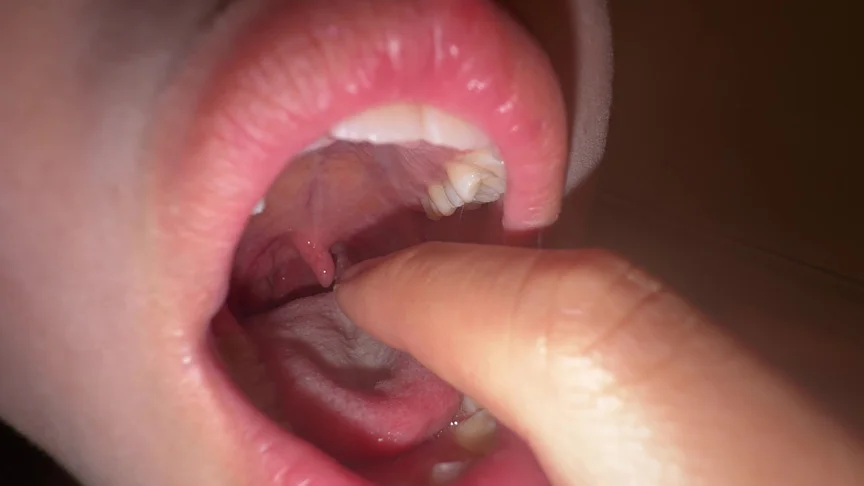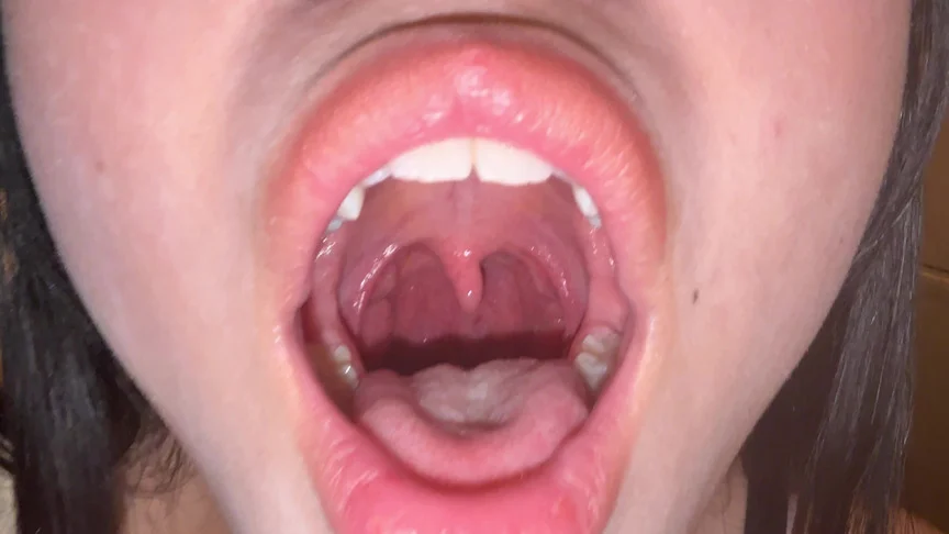 パッカ~ンと開いて奥まで御開帳!白い舌苔付きベロが際立って見えますw唾液でネットりしていて結構大振りな巨根喉チンコwなんか左に曲がってますw他人には一度も触られたことが無いという優亜ちゃんの喉チンコ。