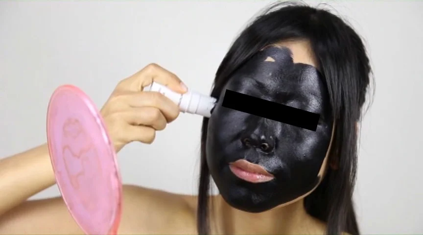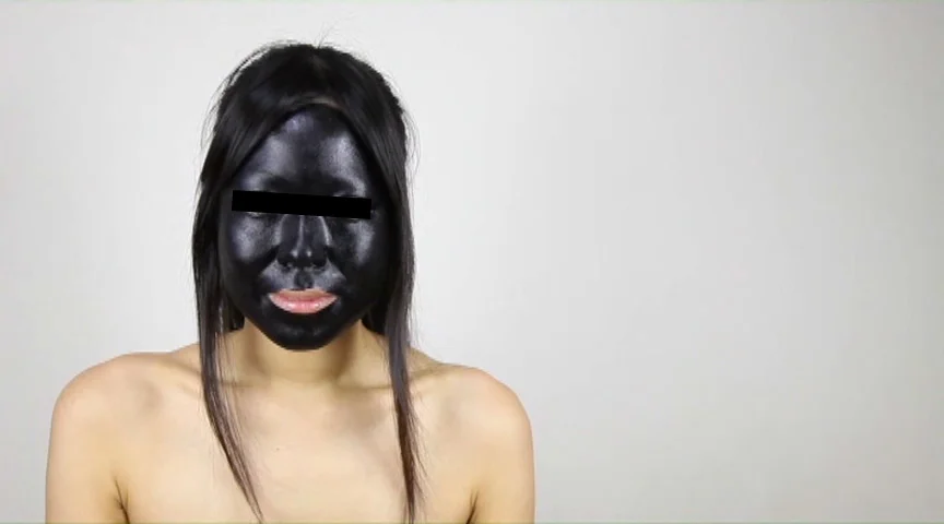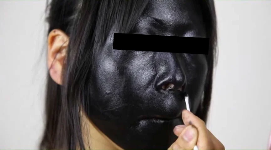 今作では、スティックファンデーションを使用し、全身を真っ黒にしていきます。まずはまゆげを太く塗っていき、つなげて、次は口周り。ドロボウさんのできあがり!!楽しんでますね!!そのまま顔全体を塗っていき、綿棒で細かいところも塗れば顔は完成!!そして耳、身体と全身真っ黒に塗っていきます。