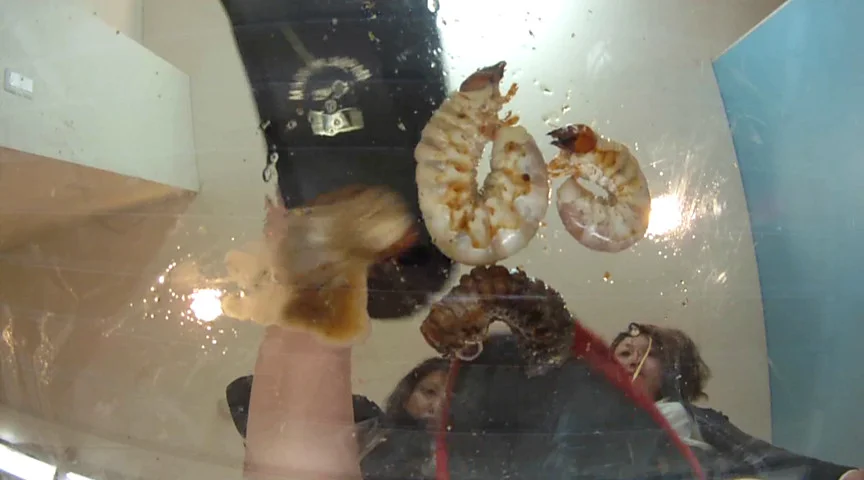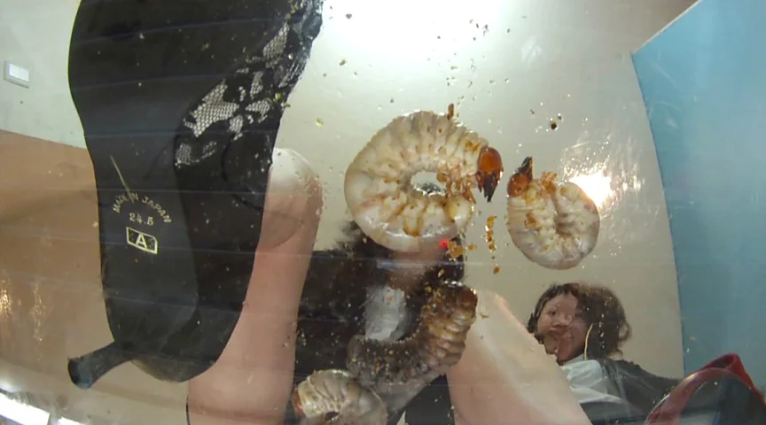1匹数千円はする高価な輸入カブト虫の幼虫を次々と踏み潰す。懸命に動いて抵抗する幼虫達に、咥えタバコと仏頂面でヒール底をガラステーブルに擦りつけるように圧力をかけ、体内からはいたいけな汁が飛び散る。何ともなかったかのように彼女達はその場を去っていった。