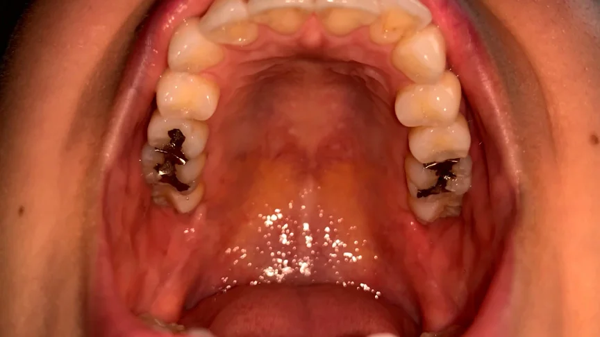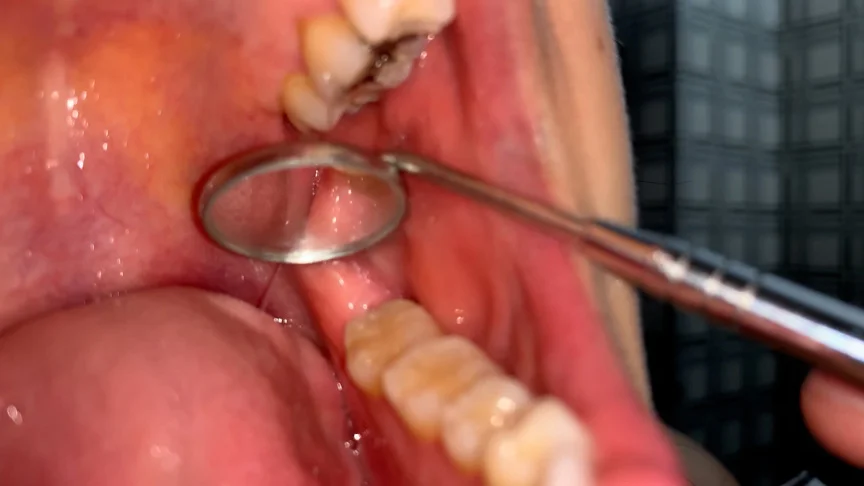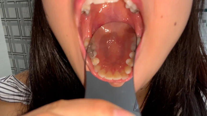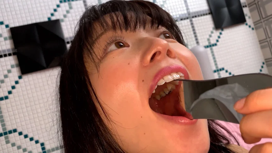 真っ白な歯の笑顔がカワイイちはるちゃん。デンタルミラーと歯鏡を使って歯医者さんごっこの様な画を撮らせてもらいましたw上の側切歯がチョンと飛び出しているのがチャームポイント!あとは完璧な歯並びです。下の歯の本数は少なめでコンパクトでキュート!奥歯は象牙色がかっていてドキドキします。上の奥歯のインレー銀歯がアクセサリーの様!可愛い!歯鏡にぶっかけしたくなる接写画です。天然歯ならではの歯周ポケットと歯の境目が黄色味がかっていてそそりますww