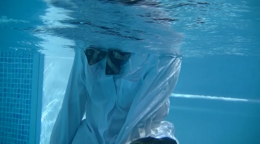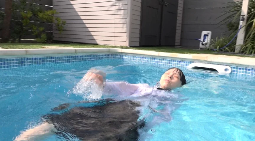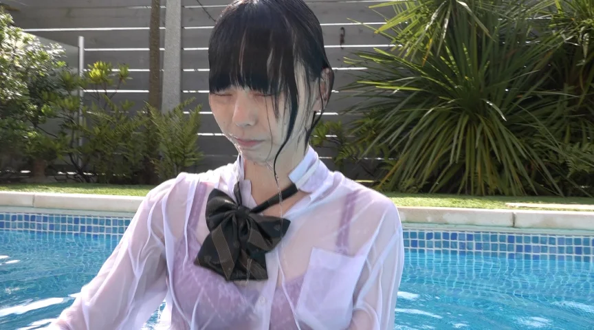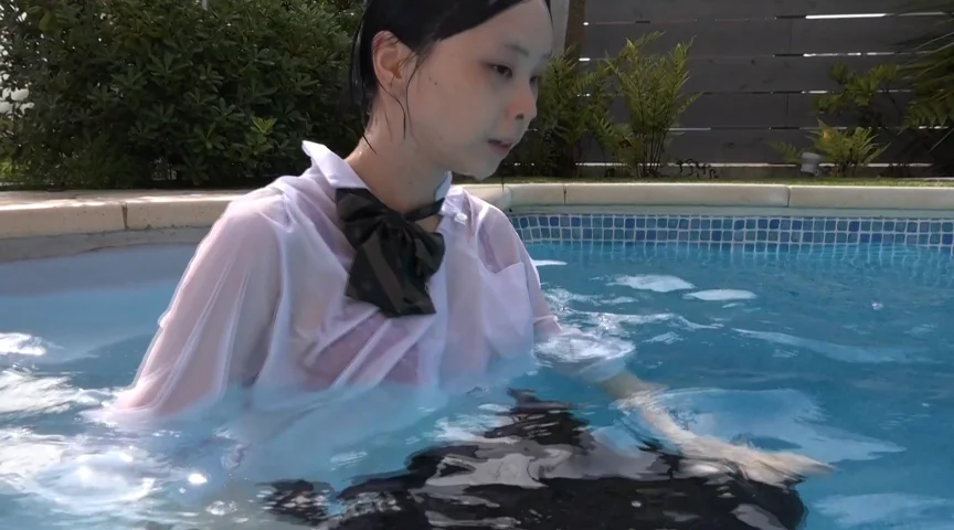 夕立で濡れた体を更にスッキリする為に…制服姿のままプールに。プールの中で背泳ぎや平泳ぎをしてまったり水遊びを楽しんでいます。プールから上がると、制服からは大量の水がしたたり落ちます。