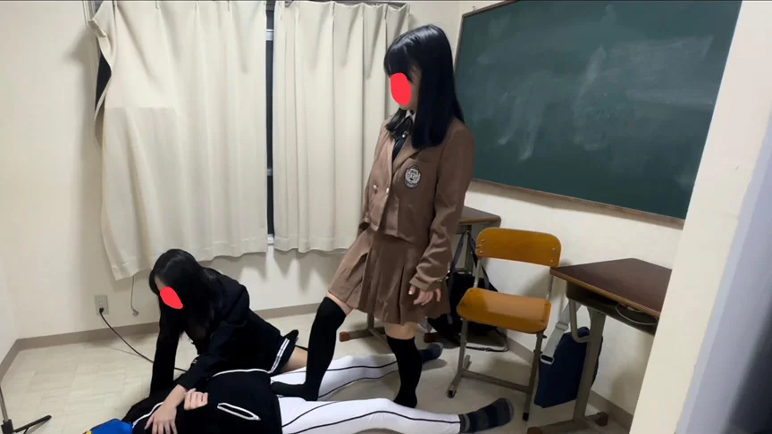 教室でまりことみさが談笑… クラスメイトのパンツ撮ったのがバレて電気アンマ処刑