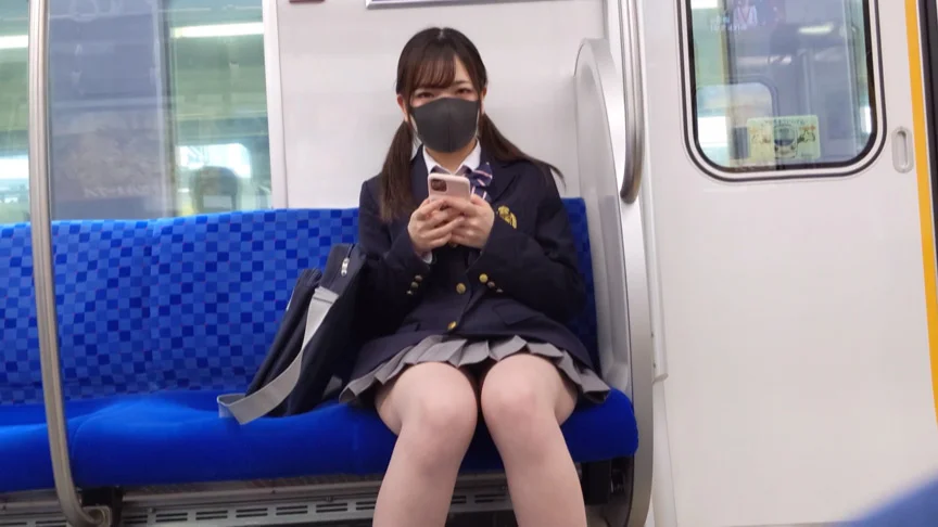 商店街を駅方面へと向かう制服JKを追跡。ホームで彼女を発見。下り方向なら…と同じ電車に乗り込み対面席も無事に確保。乗客もまばら、すいてる時間帯の電車ゆえガラガラになる。ならば…とスマホで動画を見てる風を装いながらREC。透けるような美白美脚おいしそう。夢中で画面を見る。ふと顔を見ると…、あ、目があっちゃいました。しかもニヤニヤしながらこっちを見てる。もしかして…あ、あ、あああ!デルタゾーンからピンクのパンティが!脚を閉じたり開いたり、ピンクのパンティが大胆に、時々マスクを外して微笑んでくれる女神、くそ可愛いよマジで!対面電車パンチラ盗撮。前半はスマホで撮影したパンチラ動画です。後半はおまけ映像で小型カメラで撮影した別アングル動画です。拡大したパンティーアップ動画もお楽しみください。パンチラは水平撮りです。音声ありです。 ※本編中、音声が収録されていない箇所がありますが、オリジナル・マスターに起因するものであり、異常ではありません。