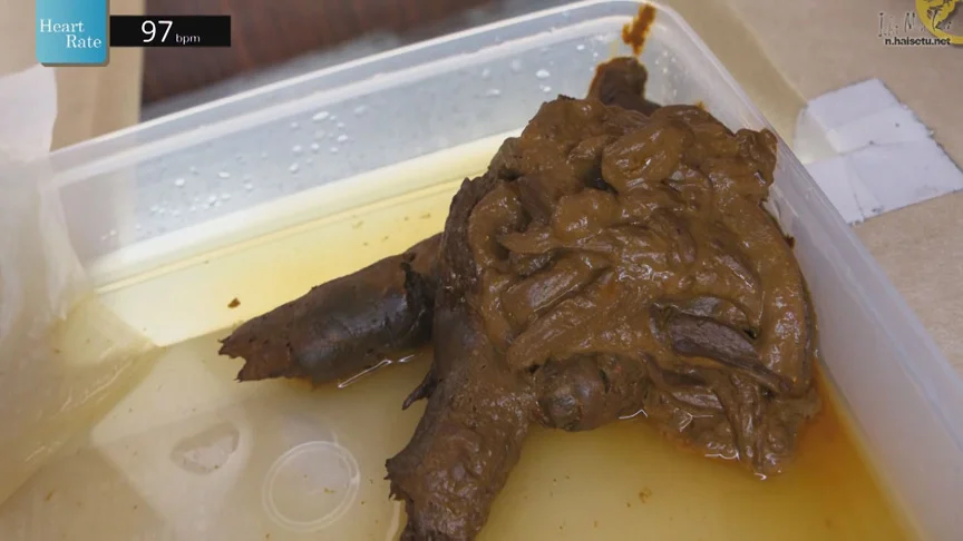 「排泄している己の姿を鏡でマジマジ見る」という行為が、どれほど羞恥を感じるものなのかを心拍数モニターで確認しながらその様子を観察するという複雑な企画。なのだが、さらに一ひねり。鏡が実はマジックミラーになっていて、その向こうにもカメラがあるということを彼女たちは知らないという状況。謹製便器台にまたがり、しゃがむと、前面にある鏡に、自ら性器をむき出して、はしたない格好でしゃがんでいきむ姿がありありと映る。彼女たちの感じている昂りは心拍数の高まりでわかる。女たちは何を感じ、どう思いながら排泄をするのか。羞恥は興奮に変わる?自己愛が、ナルシシズムが垣間見える?鏡は、複雑な乙女心を映しだす。尻穴と顔と局部と排泄物。全てが一堂に会する映像が極々実用的である。【みほ】トイレでは音を出さないと豪語するも、踏ん張った直後に特大級のおならの音を響かせた。黄色い粒の入り混じった健康的な便を出した。【ゆり】うんこを出した過ぎて開始直後から心拍数がフルスロットル。大量の尿が尻を伝い、直後には驚くほど長い一本糞がスルスルと出てきた。【みお】便が硬いのかなかなか降りて来ず、腹痛からか非常に苦しそうな顔で踏ん張ってくれた。コロコロした小さなうんこが大量に散らばった。【あおば】美人お姉さんは柔らか便をうずたかく積もらせ、あまりの恥ずかしさにインタビューでは常に涙目。混乱したような回答も見られた。(排泄屋) ※本編顔出し