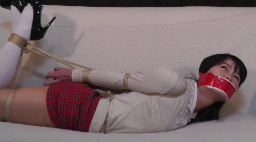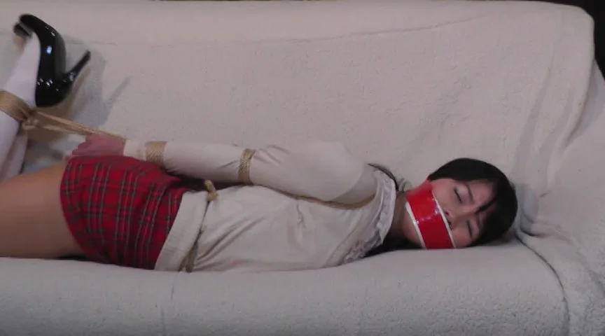 赤いチェックのミニスカートを穿いた「菅原花音」ちゃんが登場!!口をふさがれ、手を後ろで縛られた花音ちゃん。座った状態や、横向き、うつぶせなど必死にもがくがどうあがいてもロープはほどけません!!
