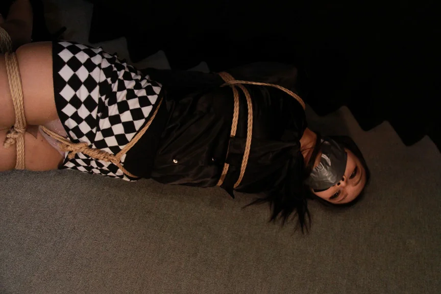 黒いブラウスに白と黒のダイヤ柄のスカートを履いた『畠中奈美江』ちゃんが登場。男に口を塞がれ、全身を緊縛されてしまう。足に食い込む縄がなんともいやらしい。スカートが短すぎてパンツが丸見えになっています。ぜひご覧あれ。