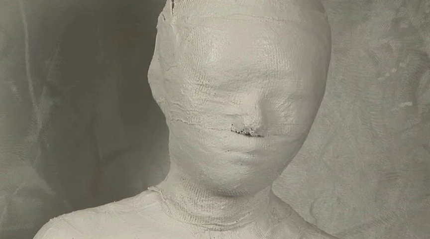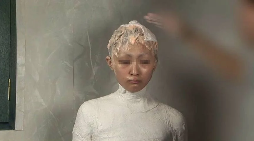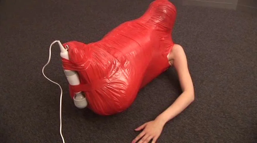 女性を、直立姿勢のまま、石膏で全身を固めていく様子を撮影致しました。石膏は毛に付くと取るのが困難になる為、パイパンになって頂いております。足先から、徐々に、石膏包帯によって固められる姿は必見です。残念ながら、直立の姿勢の状態ではバランスを取る事が難しく途中で倒れてしまいます。倒れた後は、自力で拘束状態から抜け出す姿は、まるで動くミイラ状態です。体育座りの姿勢でラップ拘束した映像を過去に撮影しておりますが、今回は、両手は拘束せず身体のみをビニールテープで拘束致しました、この為、なんだか奇妙な生物に見えます。拘束後は、男性が電マで責めた後、さらに電マもビニールテープで身体に拘束し、スイッチを「強」にして、放置致しました。最後は、ハサミを渡し、自力で出てくる姿を収録しております。