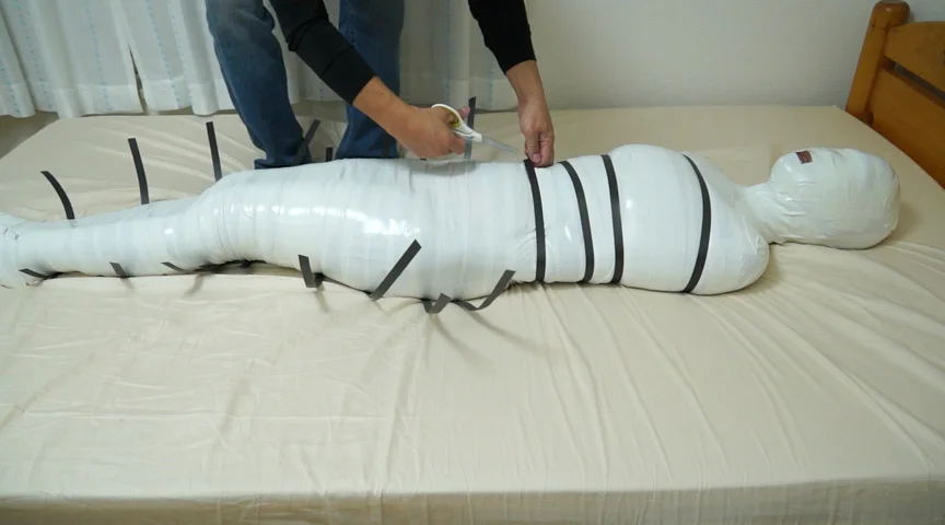 白色のビニールテープで全身グルグル巻きにして全身が動かせない状態なのに、さらに結束バンド梱包機で拘束。完全に梱包物と化した女性を、さらに口元を塞ぎ呼吸困難状態に!!じっくりとご堪能あれ。
