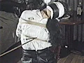 白布と黒い革による三重四重五重の凄惨猿轡。被虐の快楽に酔う進藤めぐみの姿勢には怖いものがあります。鈴のついた洗濯ばさみによる乳首責め、さらに乳首を麻縄で縛っての吊り責めが開始されます。この濃厚な被虐に酔い痴れる人妻も、さすがにのけぞり、猿轡の中の声を絞り出して許しを乞います。乳首を縛った麻紐を引っ張ると、乳首はゴムのように伸びて、凄惨なシーンが展開します。正座をさせての髪吊りの非常さ。そして、いよいよ乳汁噴射責めの強烈な場面が開始されます。