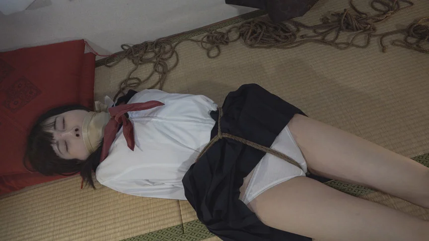 制服着衣緊縛、完全撮りおろし作品!セーラー服の上から麻縄で縛られ身悶える少女。もがけばもがくほど、縄はきしみ肉体を締めつける。パンティのワレメ部分に股縄を食い込ませられ、あらがうことが出来ない羞恥ポーズで放置される。猿轡から漏れるいやらしい吐息。執拗に視姦され被虐心に目覚める。自らエロティックに腰をくねらせ、恥悦のオーガズムに酔いしれる。
