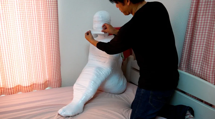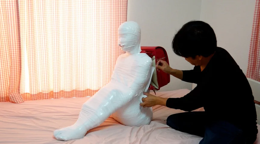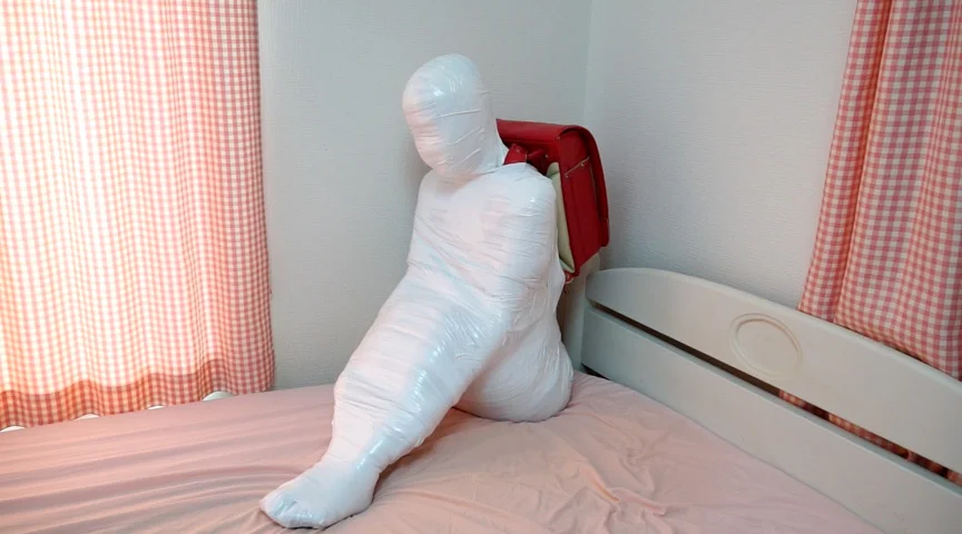 自ら、この作品のモデルに志願した、ちょっと変態?な、私です。真っ白なテープでグルグル巻かれたい…そんな危険な願望が叶いました!!撮影が始まりました。服の上からビニールテープで全身を巻かれ、全く動く事ができなくなった状態で、さらに監督さんが、帽子や、マスク、ランドセルを私に付け、なにやら満足そうにしている様です。「これで終わってしまうのかな?」そう思っていた時に、不意に身体が持ち上げられ、どこかに運ばれました。監督さんは、私を、物の様に扱い、どこかに移動したみたいです。「まだ何かするの…?」「まだ終わらないの??」耳をすますと「カシャ!!カシャ!!」と、聞こえてくるので、どうやら写真撮影をしているみたいです。しばらくすると、写真の撮影が終わったらしく、私は又、監督に物の様に扱われて、元のベッドへ戻されました。完璧主義の監督さんは、口元がまだ、塞がっていない事が気に入らないらしく「ちょっとの間だけ、口元を塞ぐから」と言って、私の口元まで塞いでしまいました。私は、完全にテープで巻かれ、完全に包まれてしまいました。これは、私が望んでいた事…。