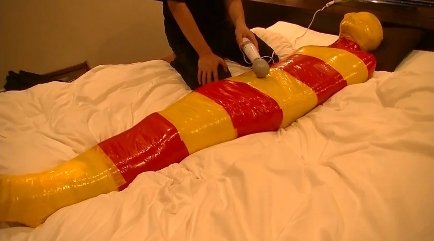 全身完全拘束のマミフィケーションプレイ。動画は、すべて巻き終わった後の様子になります。ビニールテープの上から電マで刺激。途中でかろうじて隙間のある鼻の部分を塞ぎ、完全に呼吸を制御する。徐々に鼻息が荒くなるのが分かる。