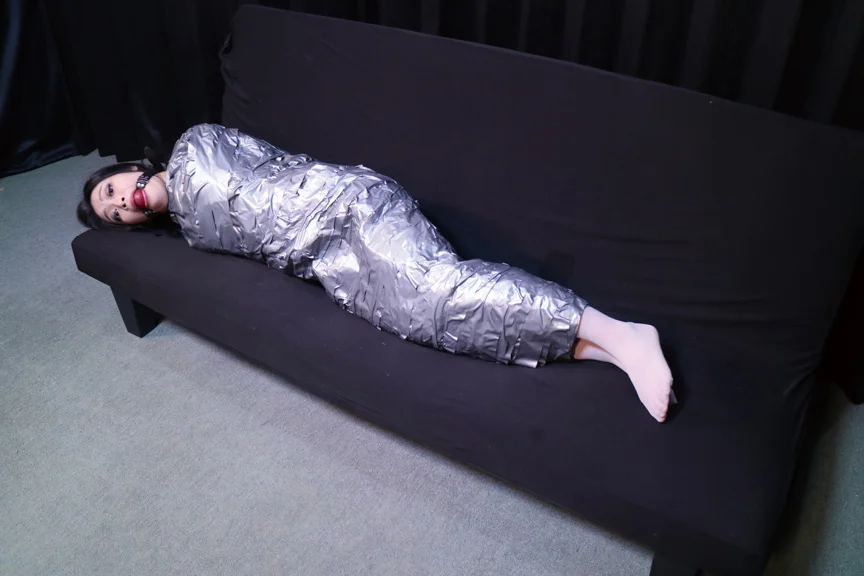白のボディースーツ姿の「畠中奈美江」ちゃんがボールギャグを噛ませられ、後ろ手に縛られ身動きが取れない状態にされます。その後、ソファーの上に連れてこられ全身を銀色のテープでぐるぐる巻きにされマミー状態に…。