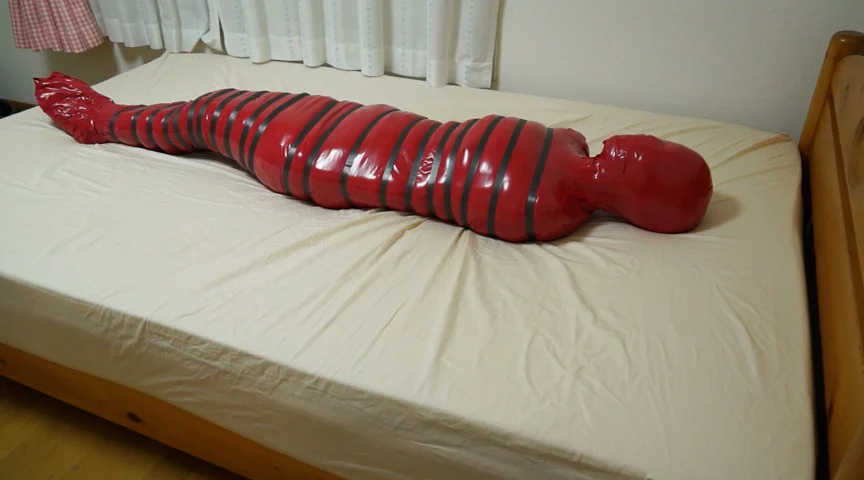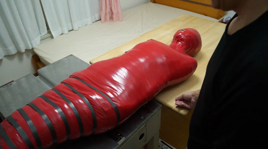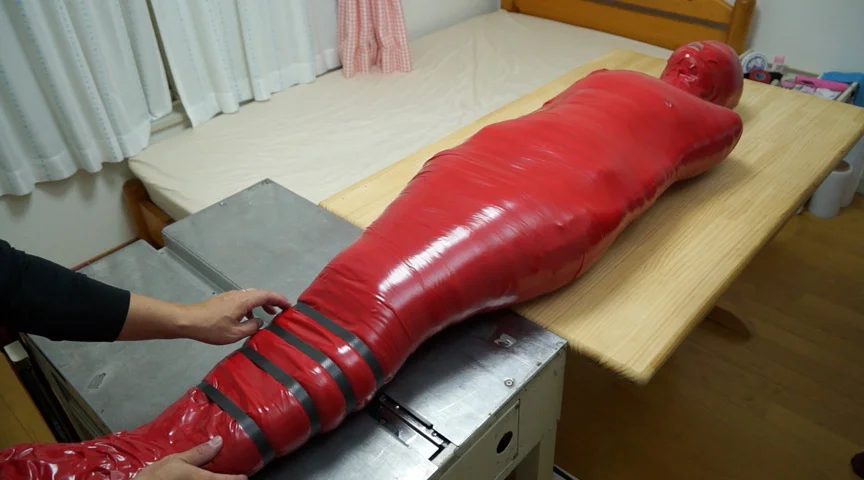 アンケートで、黒色の次に人気だった赤色のビニールテープを使い、以前使用した梱包機で今回はもっと多く結束し、さらに動けない状態に…。この状態で呼吸穴まで塞ぎ、更にスタンガンで…。最後は呼吸穴を塞いだまま、電気を消してスタッフが立ち去ってしまい、彼女はどうなるのか…。人体に対して、スタンガンを使用する行為は大変危険ですので真似をしないでください。